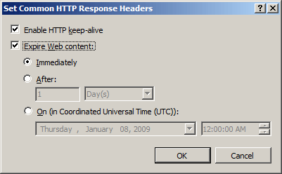 在“设置通用 HTTP 响应标头”对话框中,选中使 Web 内容过期的复选框,选择在特定时间间隔后过期或在特定时间过期的选项,然后单击“确定”。