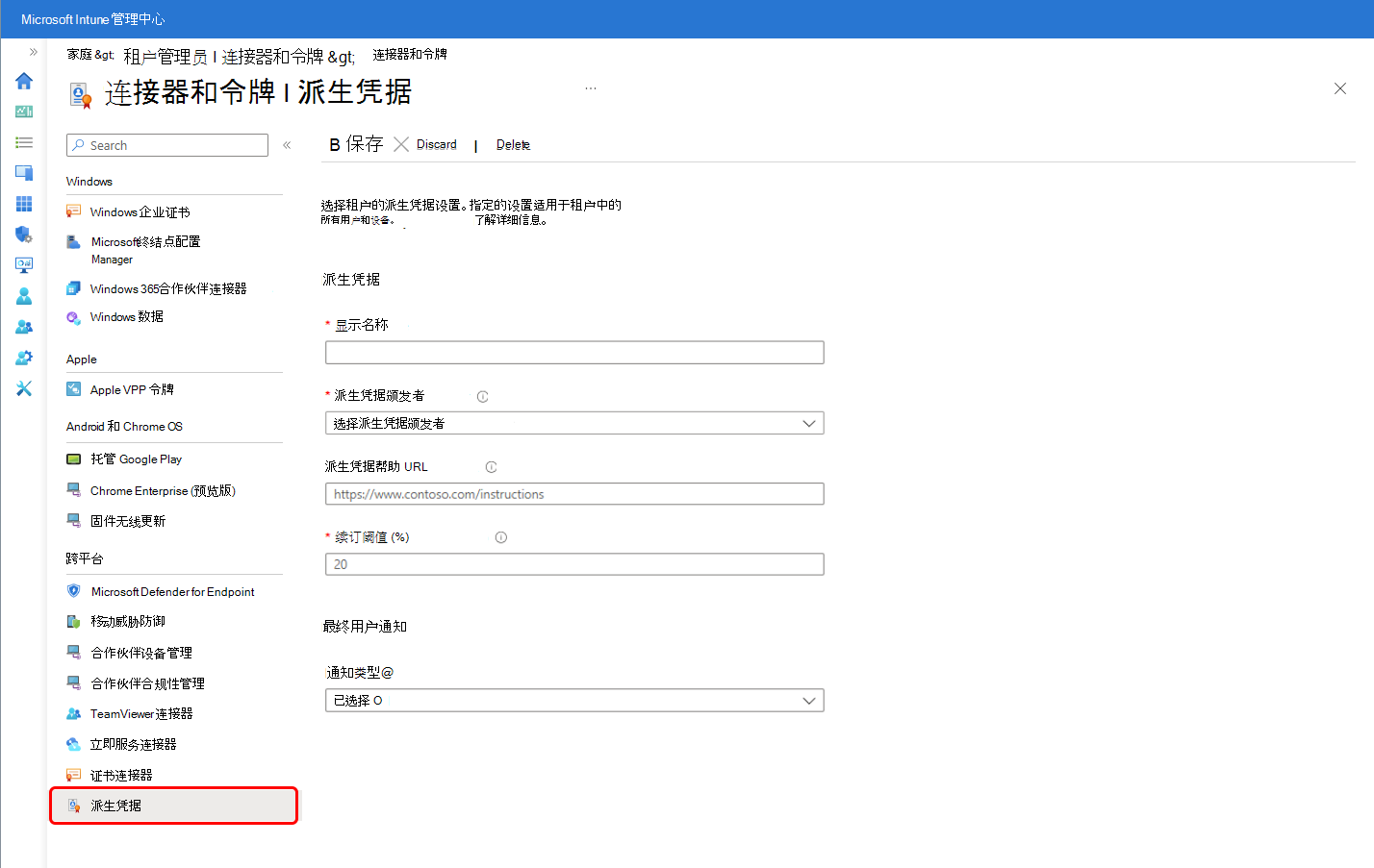 在创建需要使用派生凭据的策略之前,请在 Microsoft Intune 管理中心设置凭据颁发者。 派生凭据颁发者是租户范围的设置。 租户在同一时间仅支持一个颁发者。