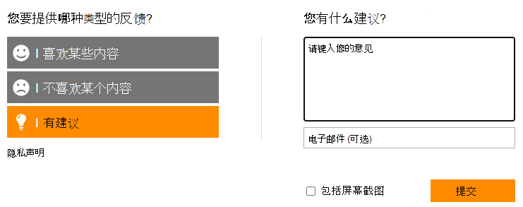 我们重视你的反馈。 若要提交功能建议和报告问题,可以使用 Microsoft 365 应用版管理中心右上角的“反馈”按钮。