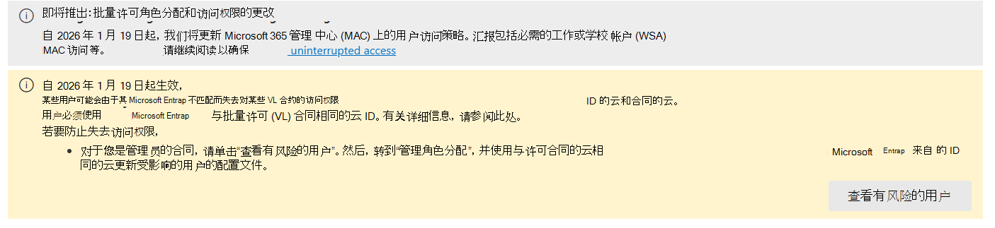 - 在管理中心的“计费>产品>批量许可”页上,顶部会显示一个横幅,上面显示“由于Microsoft Entra ID云与合同云不匹配,某些用户可能会失去对某些 VL 合同的访问权限。选择“查看有风险的用户”。