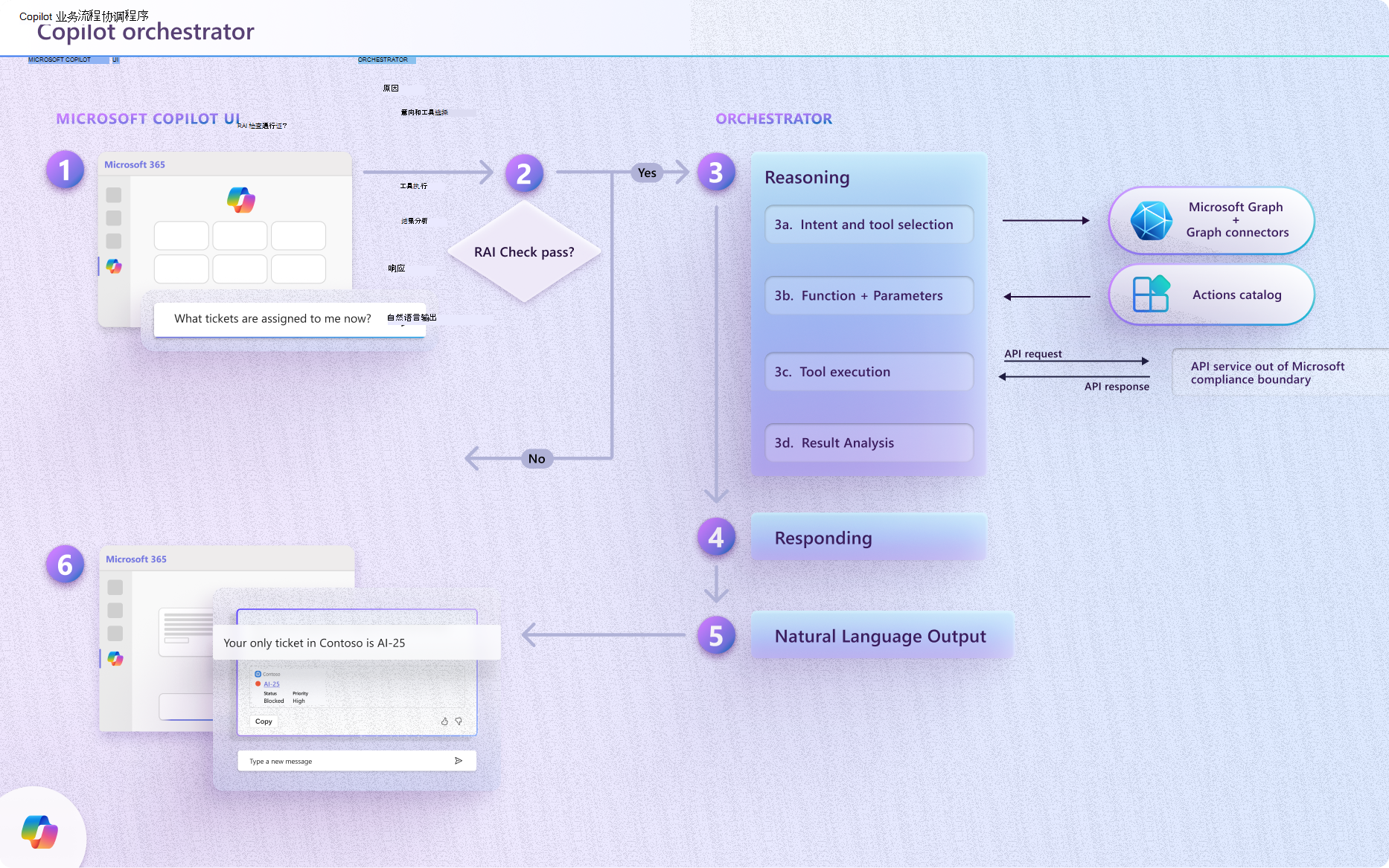 在用户的自然语言输入和 Copilot 的自然语言输出之间,Copilot 业务流程协调程序在后台工作,从代理中的正确操作中选择和运行正确的技能。