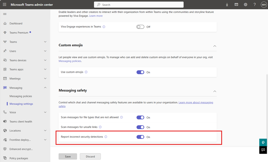 - 在 Teams 管理中心中:设置控制用户是否能够报告来自 Teams 标记为安全风险的邮件的错误检测。 关闭此设置后,用户无法在 Teams 中报告邮件,因此Microsoft Defender门户中的相应设置无关紧要。
