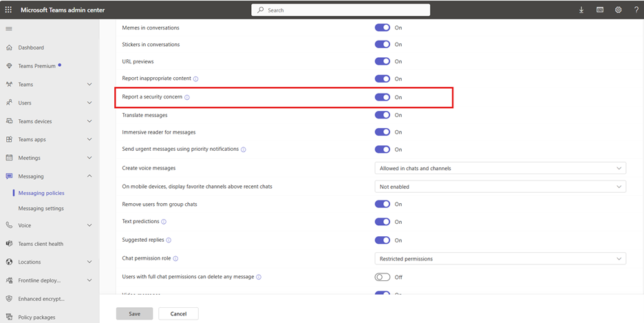 在 Teams 管理中心中关闭或打开安全隐患的用户报告