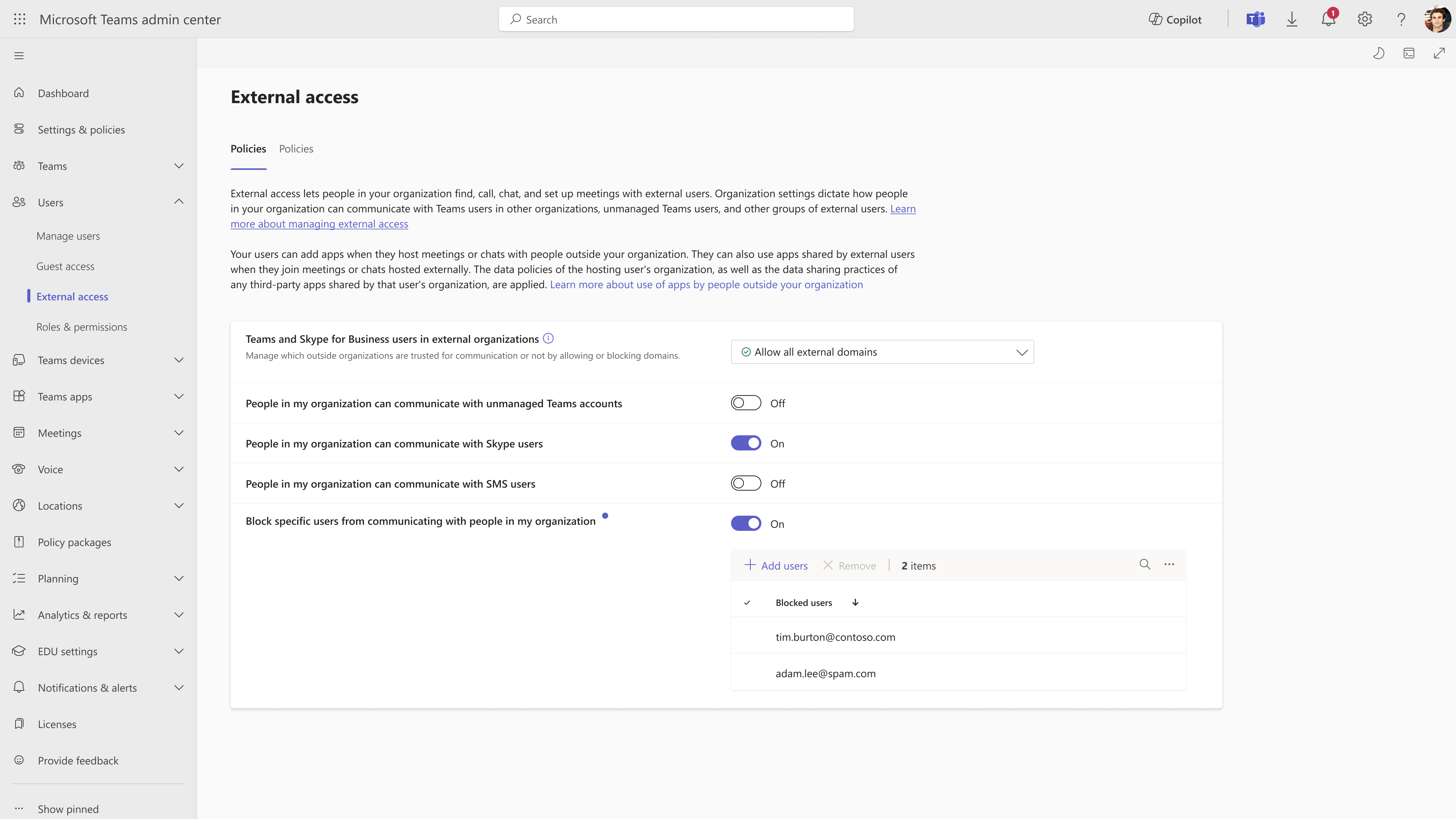 在 Teams 管理中心,转到 “用户”>“外部访问”。