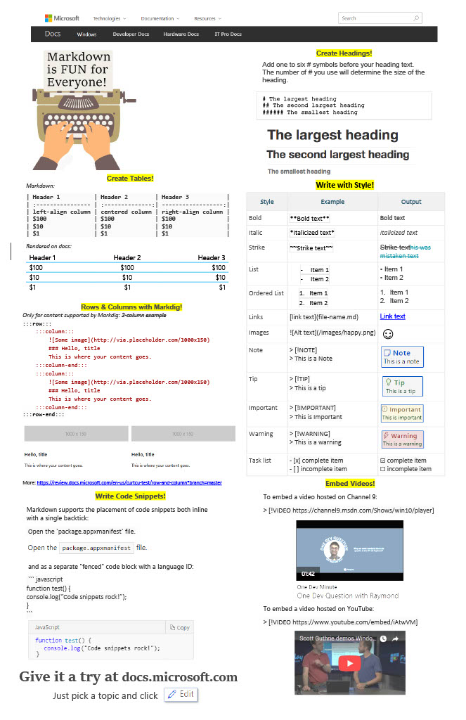 - Visual Studio Code 的 Docs Markdown 扩展 - 使用 Alt+M 调出文档创作选项菜单,例如: