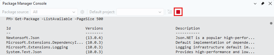 “停止”命令执行。 例如,运行 Get-Package -ListAvailable -PageSize 500 列出了默认源上的前 500 个可用包,例如 nuget.org,这可能需要几分钟时间。