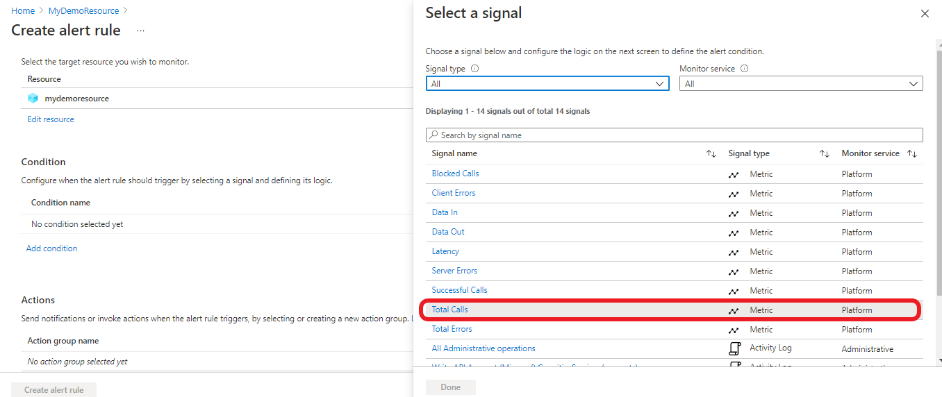 To send notifications or invoke actions when the alert rule triggers go to the Actions section and add your action group.