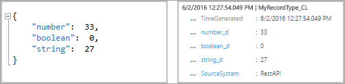 如果随后提交以下条目,则在创建记录类型之前,Azure Monitor 会创建一个具有三个属性的记录,number_s、boolean_s和 string_s。 在此条目中,每个初始值的格式都设置为字符串: