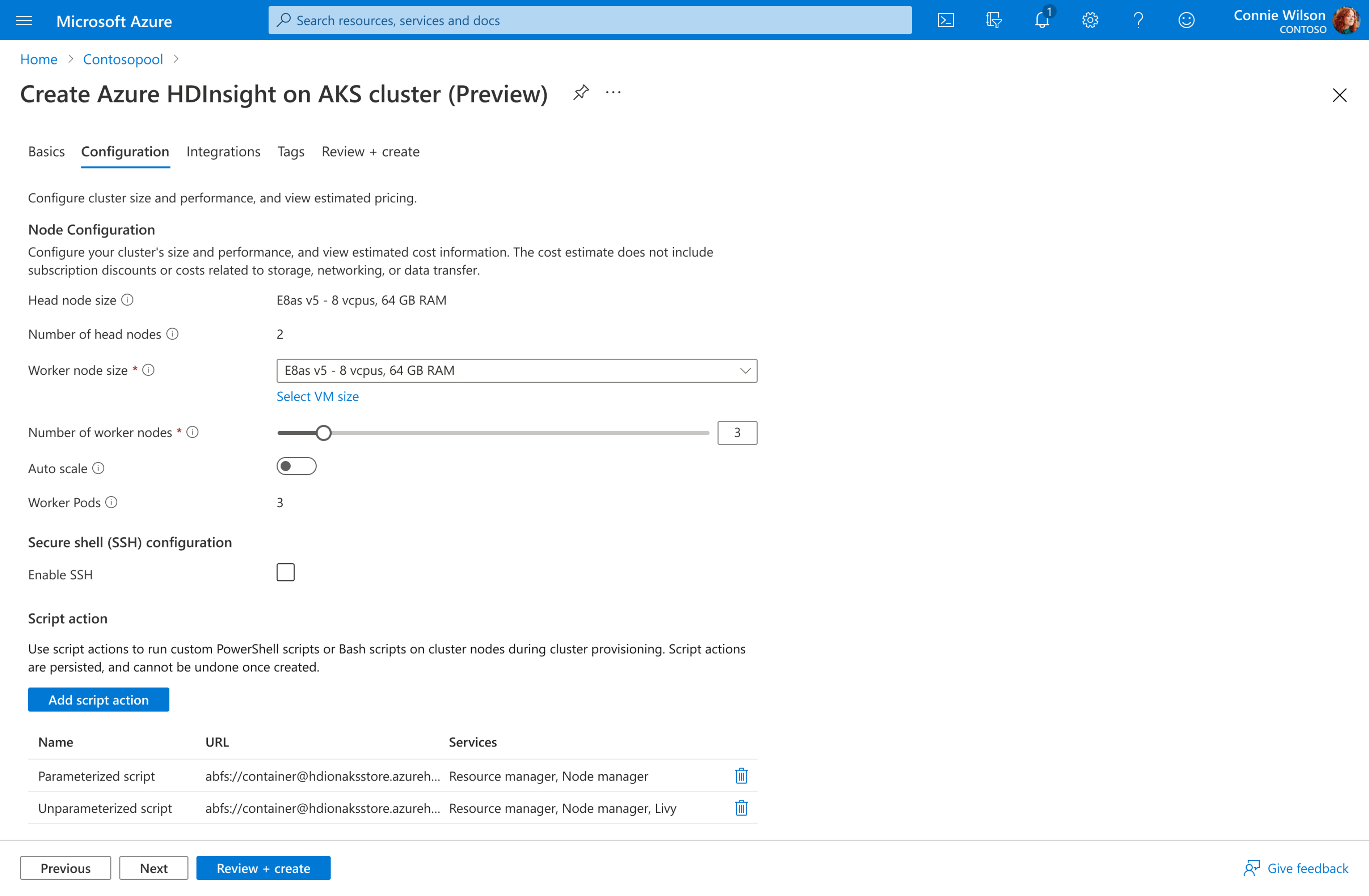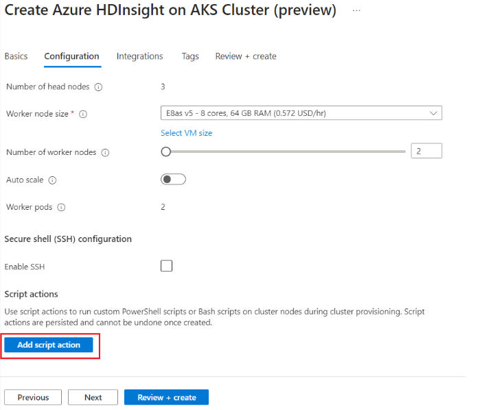 在 AKS 上,Azure HDInsight 提供了一种称为 脚本操作 的机制,用于调用自定义脚本来定制群集。 这些脚本用于安装其他组件并更改配置设置。 只能在创建群集时配置脚本操作。 创建群集后,脚本操作是路线图中的一部分。 本文介绍如何在创建 AKS 群集上的 HDInsight 时预配脚本操作。