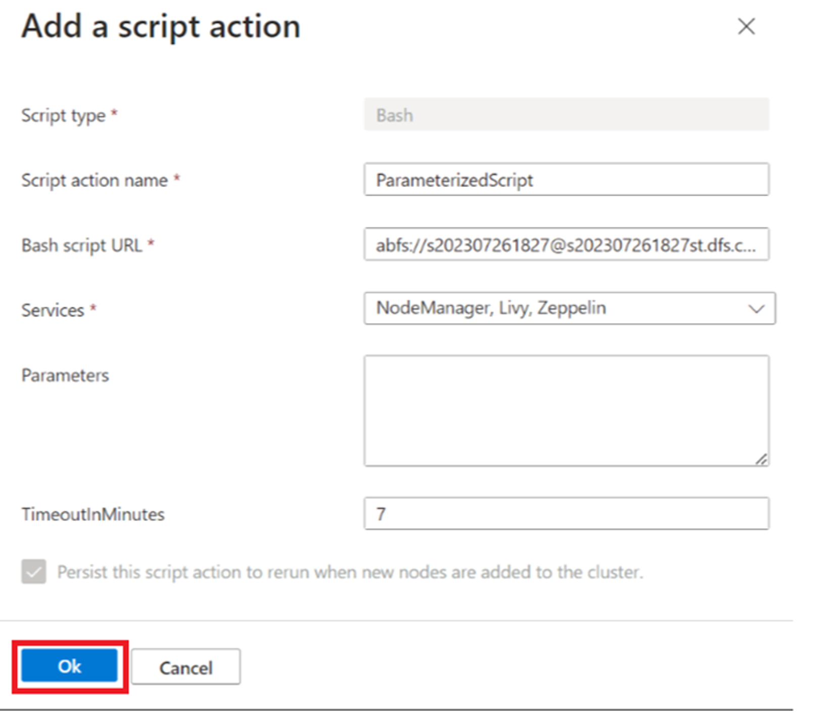 Bash 脚本 URL 存储脚本的位置。 例如 - abfs://<CONTAINER>@<DATALAKESTOREACCOUNTNAME>.dfs.core.windows.net/<file_path>,更新 Data Lake 存储名称和文件路径。