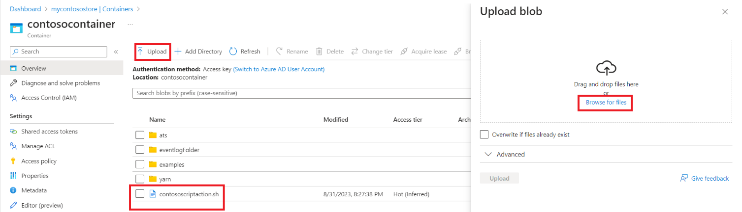 2. 若要将脚本上传到存储中,请导航到目标存储和容器。 单击“上传”按钮,然后从本地驱动器中选择脚本。 上传脚本后,应能够在容器中看到该脚本(如下图所示)。