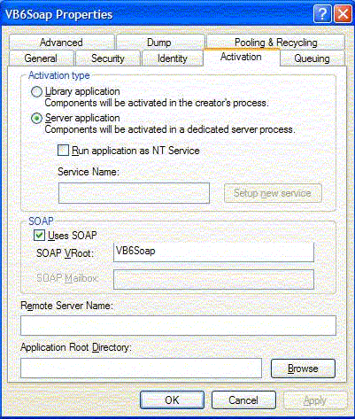 创建 Visual Basic 应用程序后,需要将其注册为 COM+ 应用程序。 启动组件服务管理工具,并在 Windows XP 上创建 COM+ 应用程序。 (在此示例中,应用程序名为 VB6Soap.) 导入作为组件创建的 DLL。 然后导航到“COM+ 应用程序属性”页的“ 激活 ”选项卡,选择“ 使用 SOAP”,输入 SOAP Vroot(如 VB6Soap),然后单击“ 确定”,如图 1 所示。
