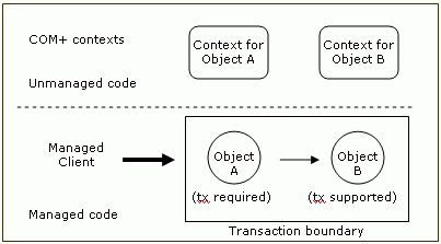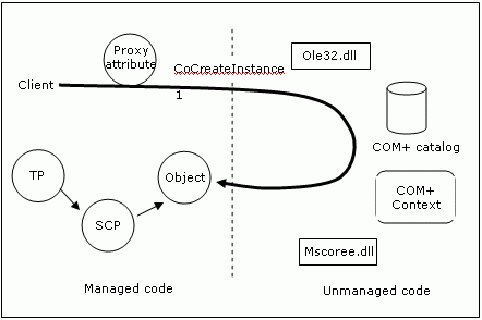 因此,激活链已自定义,以创建自定义真实代理 (用于拦截) 并创建非托管上下文,使 COM+ 仅具有执行拦截服务语义所需的上下文基础结构。 COM+ 上下文现在与托管对象(而不是 COM 对象)关联。