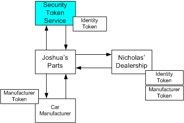 一家零部件公司 Joshua 的部件公司将转到制造商并出示(并证明)其身份安全令牌(例如,从图示的安全令牌服务)并请求制造商的安全令牌,指出他们是经过认证的零部件经销商(假设他们经过认证且状态良好)。 约书亚的部分随后可以联系尼古拉斯的经销商,并提供(并证明)这两个安全令牌。
