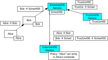 Web 服务安全性支持委派。 下面是一个复杂的委派方案,旨在显示方法的灵活性:Alice 使用 calendar456 来管理她的计划。 她想允许鲍勃在周二与她举行会晤。 但是,Bob 不会直接执行计划。 相反,Bob 使用服务计划 456 来设置需要放在 Alice 日历上的会议。