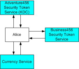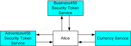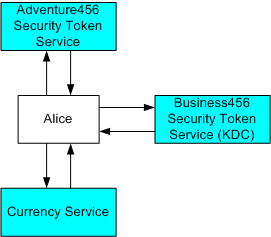 在此方法中,货币服务的策略指出它只接受 Business456 颁发的安全令牌。 由于该策略指示在何处获取所需的安全令牌,Alice 向 Business456 安全令牌服务提供 Adventure456 安全令牌,并接收 Business456 安全令牌。 然后,她向货币服务提出(并证明)此安全令牌。 下图对此进行了说明: