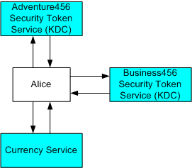 在此方法中,Adventure456 已颁发 Alice 一个 Kerberos 安全令牌,货币服务的策略指示它只接受其自己的安全令牌服务颁发的安全令牌。