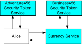 Alice at Adventure456 希望使用 Business456 的货币 Web 服务。 货币服务将仅处理具有 Business456 颁发的安全令牌的请求。 Alice 仅具有由 Adventure456 颁发的标识声明(即标识安全令牌)的安全令牌。