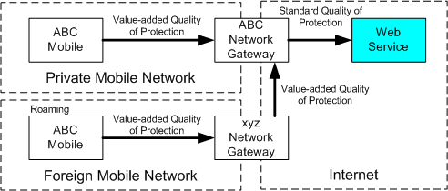 下面是合并这两个想法的示例。 当网络运营商支持移动客户端(使用这些 Web 服务安全规范)时,可以将这些客户端配置为通过网络运营商的网关发送请求。 在此方案中,网关是一个 SOAP 中介,它积极参与整个消息流;具体而言,网络运营商正在提供专为移动设备设计的增值加密算法。 网关可以增强或更改消息的安全令牌和保护质量。 请注意,即使设备在外部网络上漫游,此 Web 服务安全模型中固有的灵活性也允许此解决方案。