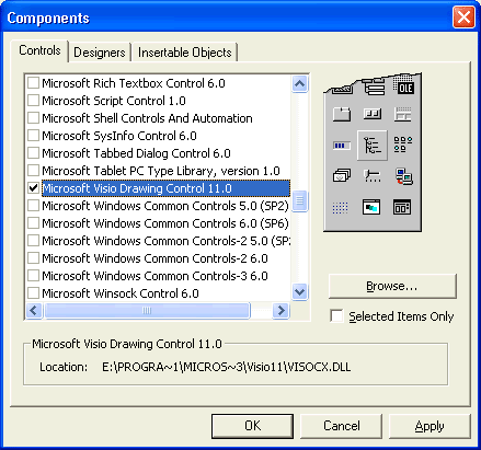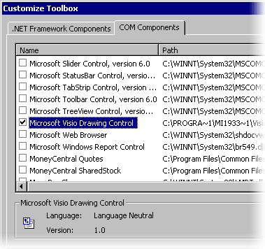 单击 Customize Toolbox 对话框中的 COM Components 选项卡。为类型库选中 Microsoft Visio Drawing Control,如图 2 所示。
