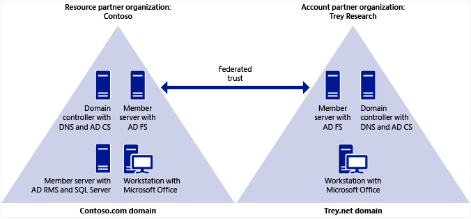 | Step 2: Preparing the account partner organization (Trey Research) | Creates the Trey.net domain, with two servers and one Windows client computer. One server is the domain controller with DNS and an enterprise CA, and the second server is for AD FS. Additionally: DNS is configured, the AD FS URL is added to the local intranet zone for clients, and user accounts are created that will be used for this deployment. |