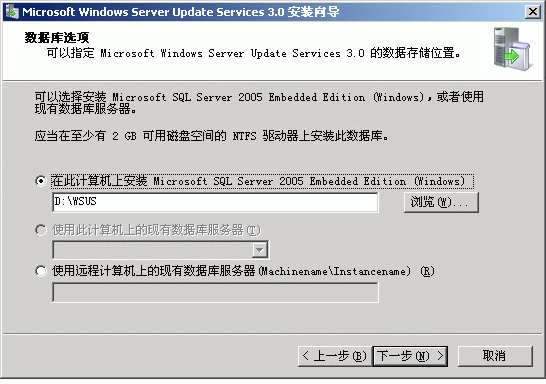 在“数据库选项”页中,选择用于管理 WSUS 3.0 数据库的软件。默认情况下,如果要安装的计算机运行 Windows Server 2003,WSUS 安装程序将会安装 Windows Internal Database。