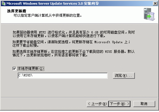 在安装向导的“选择更新源”页中,可以指定客户端获得更新的位置。如果选中“在本地存储更新”复选框,则会将更新存储在 WSUS 3.0 服务器上,您需要在文件系统中选择一个用于存储更新的位置。如果不在本地存储更新,客户端计算机将连接到 Microsoft Update 以获取已审批的更新。请保留默认选项,然后单击“下一步”。