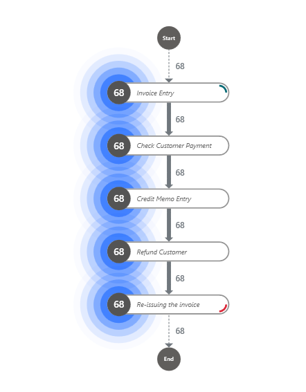 查看流程图时,您会发现发票输入和重新开具发票活动的案例数最多,这是正常的,因为它们是流程的起点和终点。 案例数仅次于上述两项的活动是完成客户备忘录。