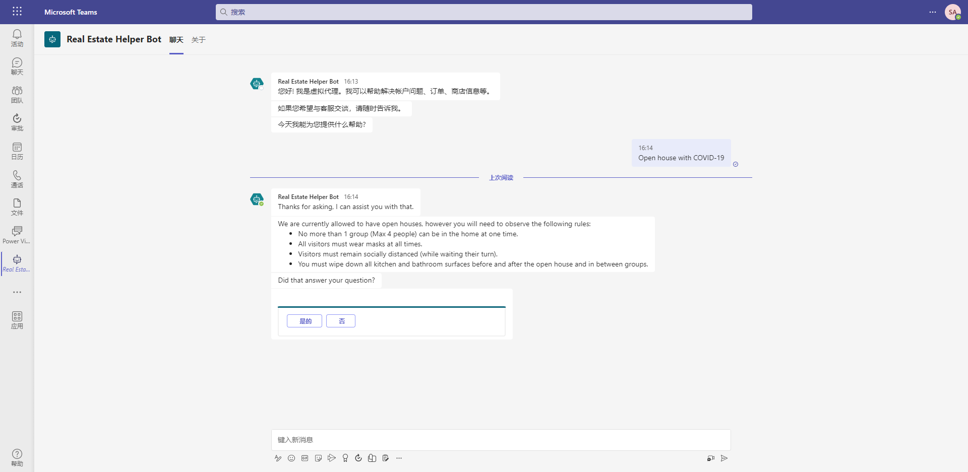 下图显示了一家房地产公司在 Microsoft Teams 中创建了一个嵌入式代理来协助房地产经纪人开展开放日活动。