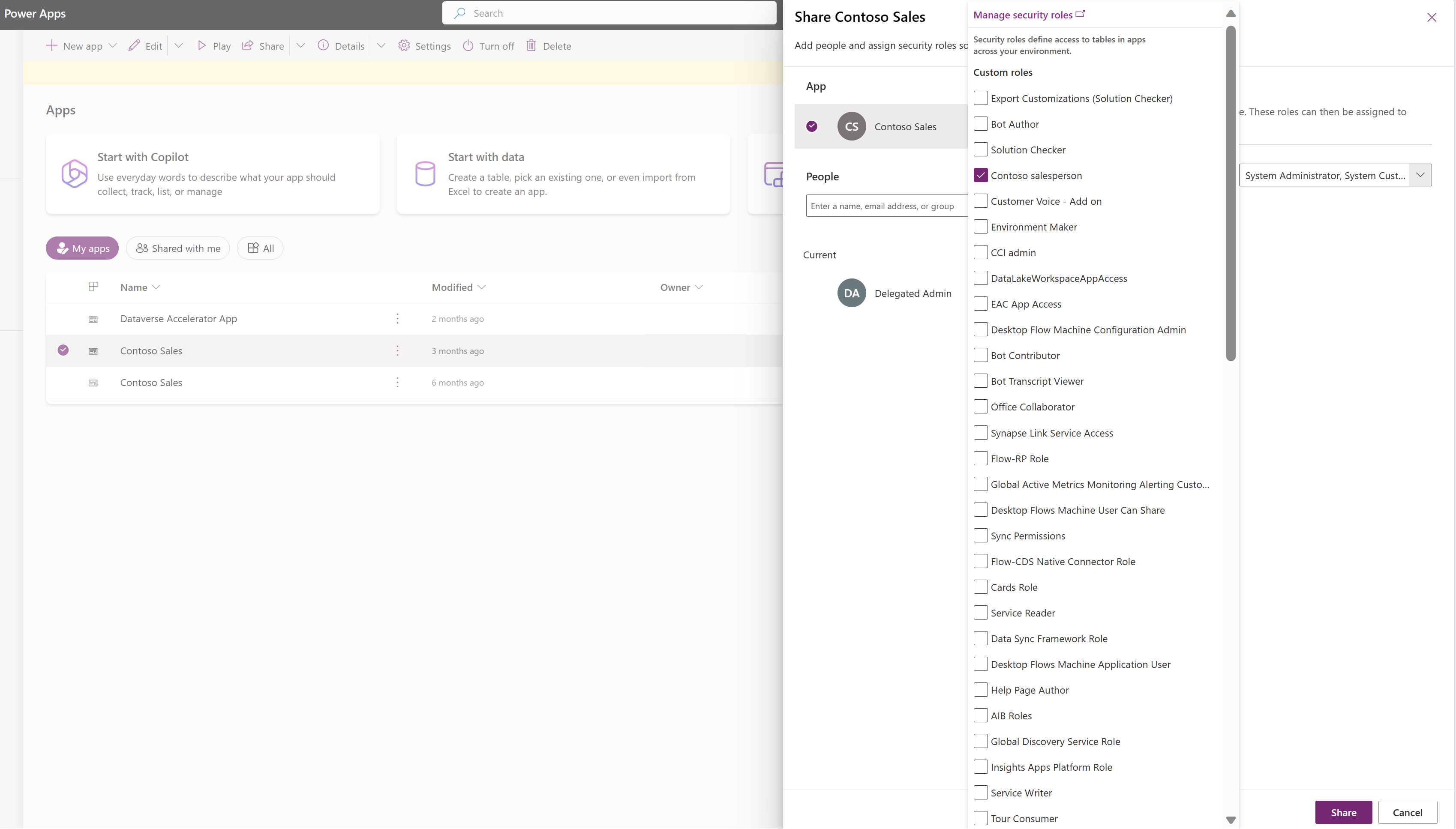 在继续之前,请确认必要的安全角色已在 Microsoft Dataverse 中创建并配置。 如果这些角色尚未定义,您需要与 Power Platform 管理员合作进行设置。 角色准备就绪后,您可以按照以下步骤有效地共享应用程序。