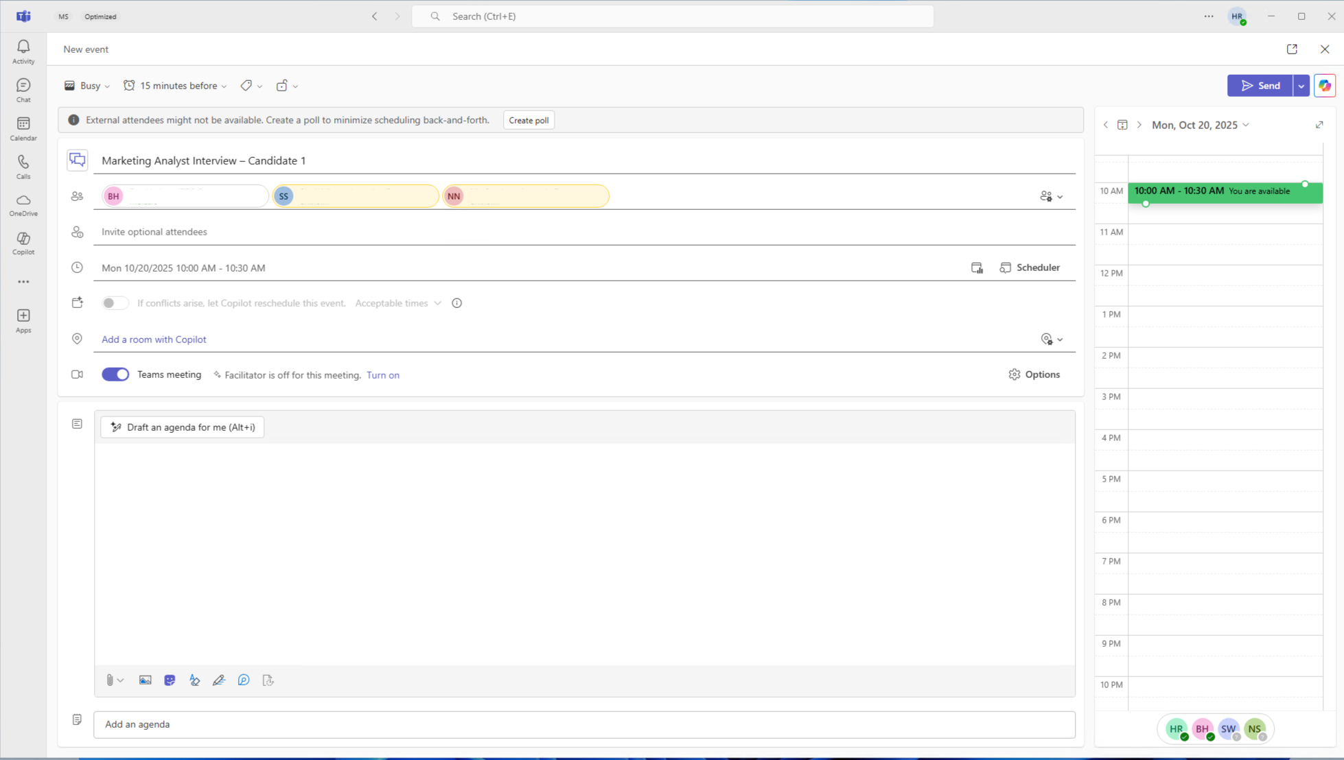 你准备面试营销分析师角色的候选人。 使用 Microsoft Teams 主持会议和 Copilot 来帮助捕获笔记、汇总响应和生成反馈。
