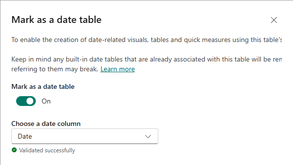 屏幕截图显示了“标记为日期表”窗口,其中已启用设置并选择了“Date”列。