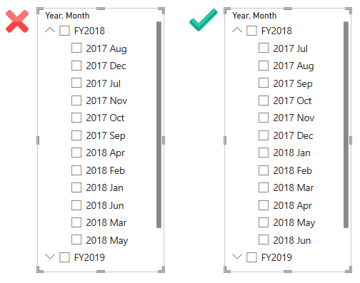 例如,在 Date 表中,Month 列包含月份的英文名称,例如 2017 Aug(对应于 2017 年 8 月)。 自然排序顺序的结果是按字母顺序列出月份,而不是按时间顺序排列(在这种情况下,八月排列在所有其他月份之前)。 在这种情况下,您可以将 MonthKey 列添加到表,其中存储包含年和月数的数值。