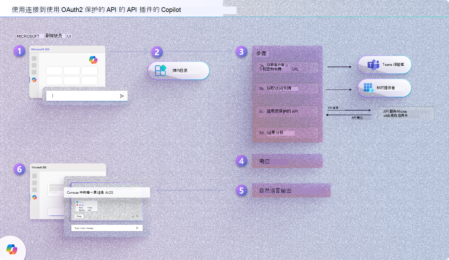 声明性代理使用 API 插件与 API 进行通信,以便读取和修改数据。 每当用户提交 (1) 的提示时,声明性代理都会评估提示,以检查合适的函数来调用 (2) 。 如果它找到与用户的提示匹配的函数,它会在必要时 (3a、3b) 进行身份验证。 然后,它生成必要的 API 请求,调用 API (3c) ,处理其响应 (3d) ,并为用户生成响应 (6) 。 下图更详细地显示了此过程: