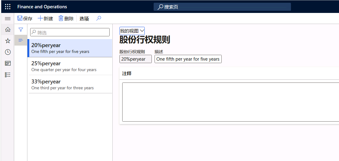 输入股份行权规则和描述的值。 您还可以根据需要在“注释”字段中为每个股份行权规则添加注释。