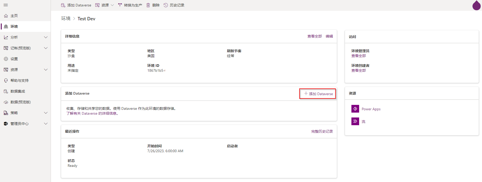 本单元的重点是将 Dataverse 添加到不包含 Dataverse 的现有环境。 可能是因为您创建了一个最初没有 Dataverse 的环境,现在又需要这种功能。 对于任何不包含 Dataverse 的环境,可以使用以下步骤进行添加: