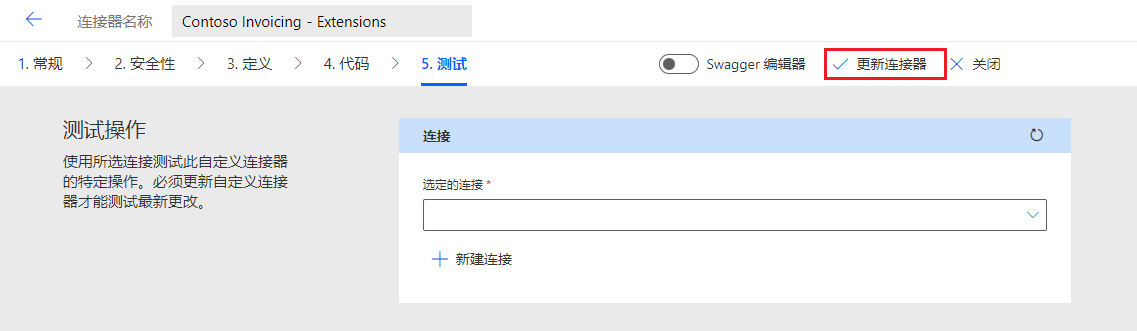 选择测试选项卡并选择更新连接器,然后等待更新完成。