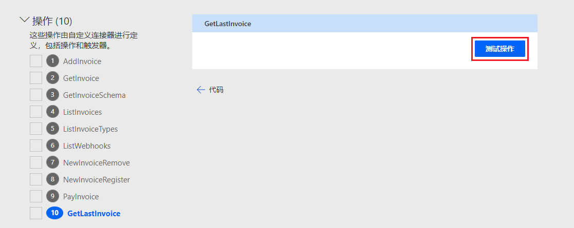 选择操作下拉菜单,然后选择 GetLastInvoice 操作。