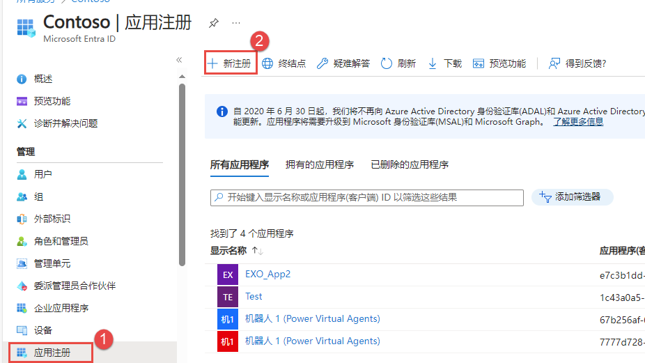 要在 Entra ID 中注册应用,您可以转到 Entra ID (Azure Active Directory) 菜单边栏的应用注册部分,然后选择新建注册。