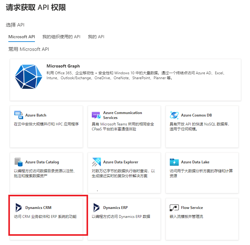 如果您的应用程序将代表登录用户访问 Dataverse,请转到已注册应用程序上的 API 权限选项卡,并确保您的应用程序被授予对 Dataverse 环境的用户模拟访问权限。