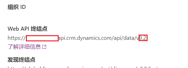 在开发人员资源页面中, 您的版本号会显示在 Web API 终结点下,如下图所示。 记下终结点和版本号。