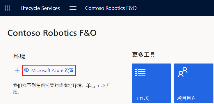 在 Contoso Robotics F&O 页面上,滚动到环境部分,然后选择 Microsoft Azure 设置。