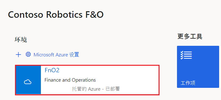 在 Contoso Robotics F&O 页面上,滚动到右侧,然后在环境部分下,选择 Microsoft Azure 设置。