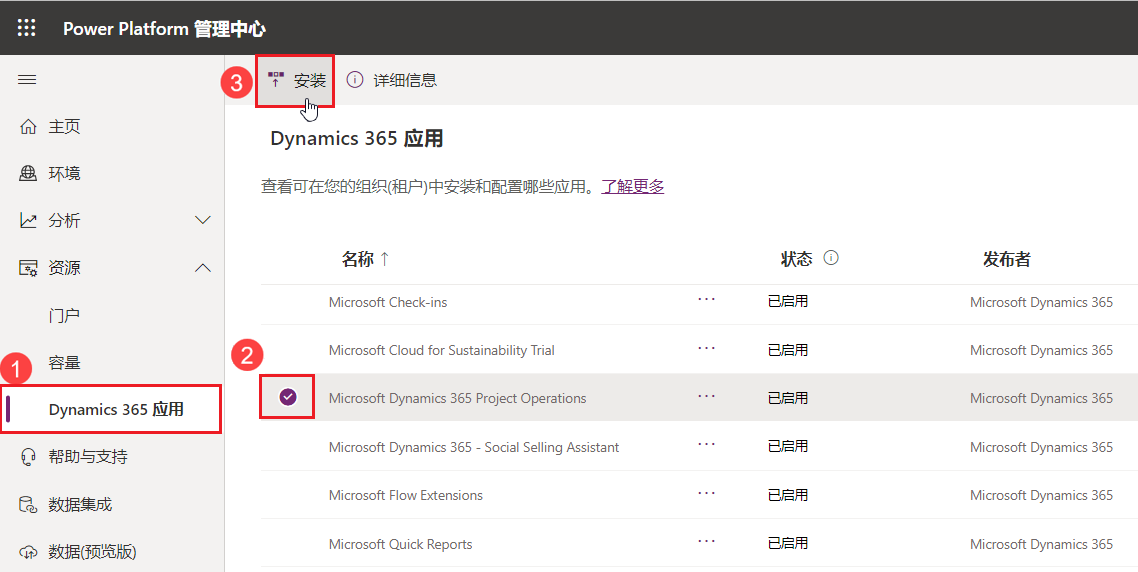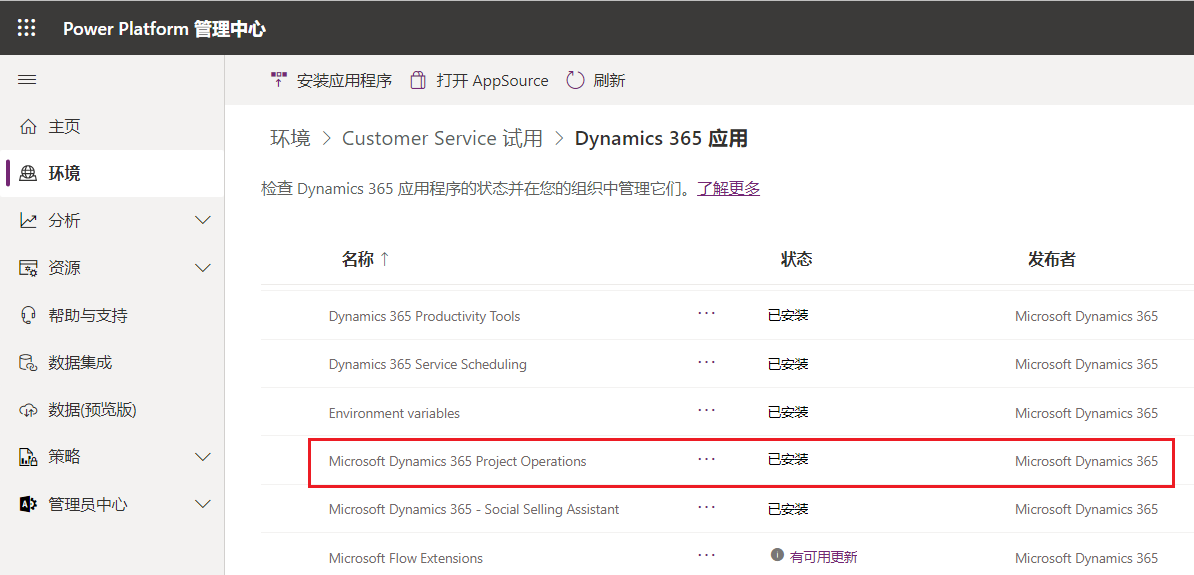 Dataverse 环境 - 安装 Dynamics 365 Project Operations