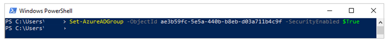 如果组的安全性未启用,您可使用 PowerShell cmdlet Set-AzureADGroup 将 SecurityEnabled 属性设置为 True:
