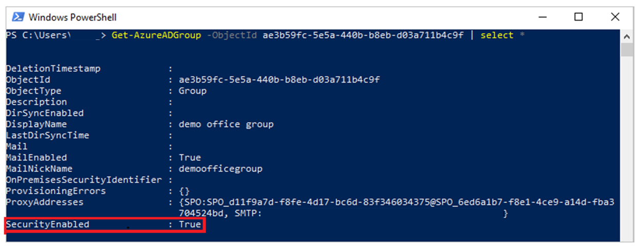 Get-AzureADGroup -ObjectId <ObjectID> | select *获取组详细信息。在输出中,请确保 SecurityEnabled 属性设置为 True。
