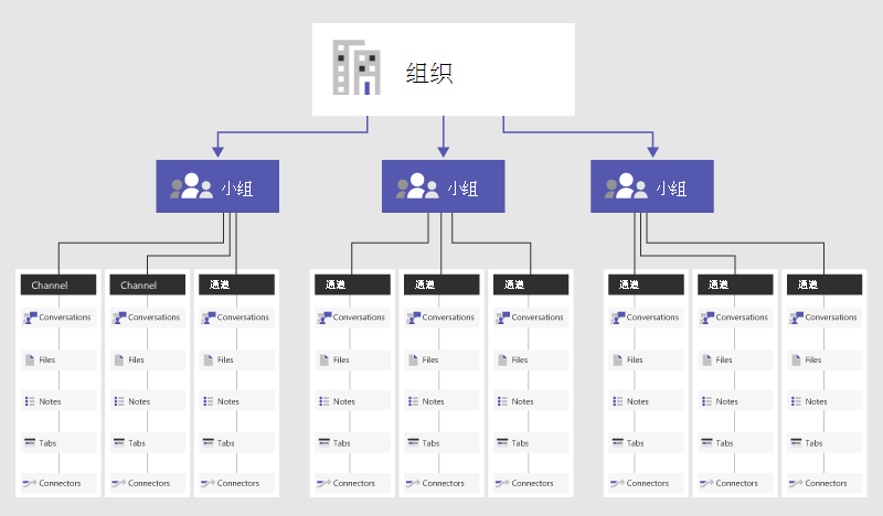 团队中的所有数据(例如跨团队频道的对话、文件、笔记)仅对团队成员可见。 你可以在每个频道的顶部找到选项卡,这些选项卡基本上是你最喜爱的文件、应用、服务的链接。 下图显示了组织的 Teams 频道的结构。