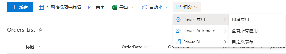 在 SharePoint 列表中,选择集成 > Power Apps > 创建应用。