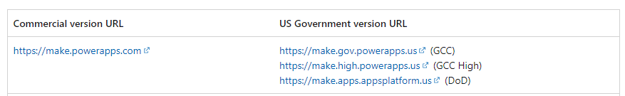 如果您的公司属于 GCC、GCC High 或 DoD 区域,Power Apps 的 URL 会有所不同,如下图所示。