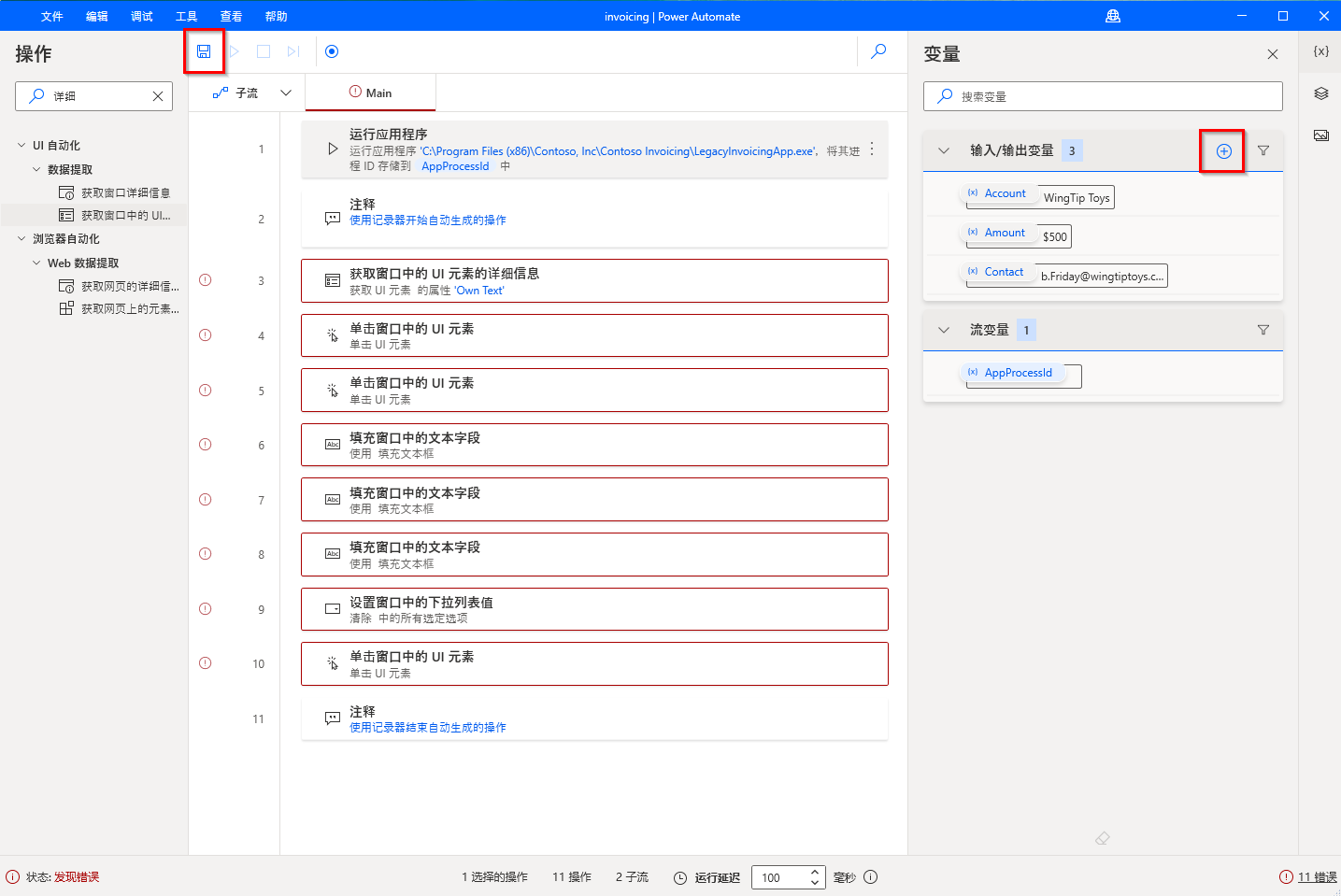 选择加号 (+) 图标,以为您的流创建更多输入变量。 如果要使用在 Contoso Invoicing 应用中生成的桌面流,额外定义三个变量: